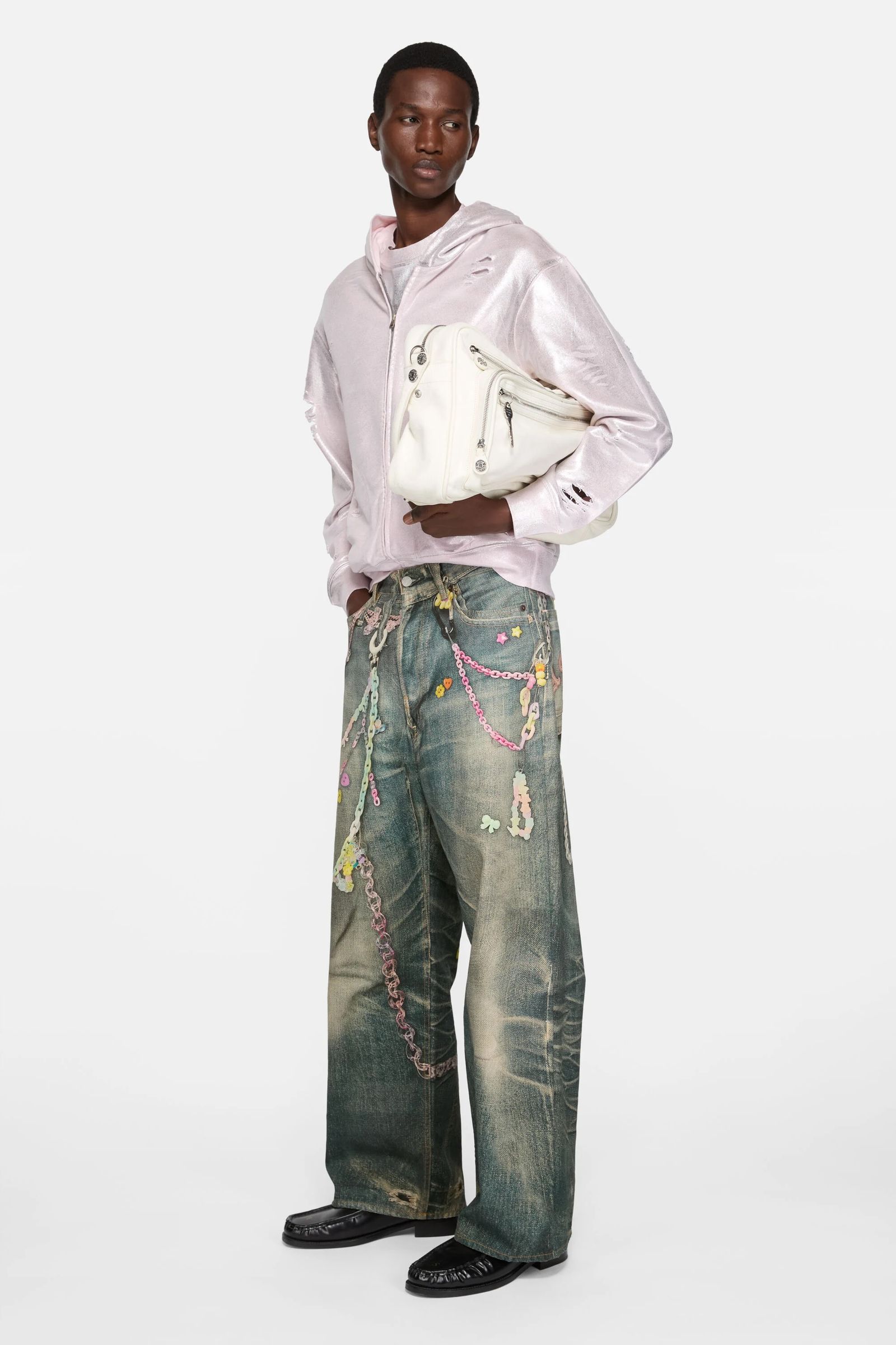 In New York, double denim dominated Spring/Summer 2025 shows with pleated and strappy details. Versace, Alexander McQueen, and Isabel Marant all wove denim into their collections. Copenhagen's Helmstedt offered patchwork jeans and jumpsuits adorned with alien and mushroom brooches, proving denim's global runway conquest was complete.