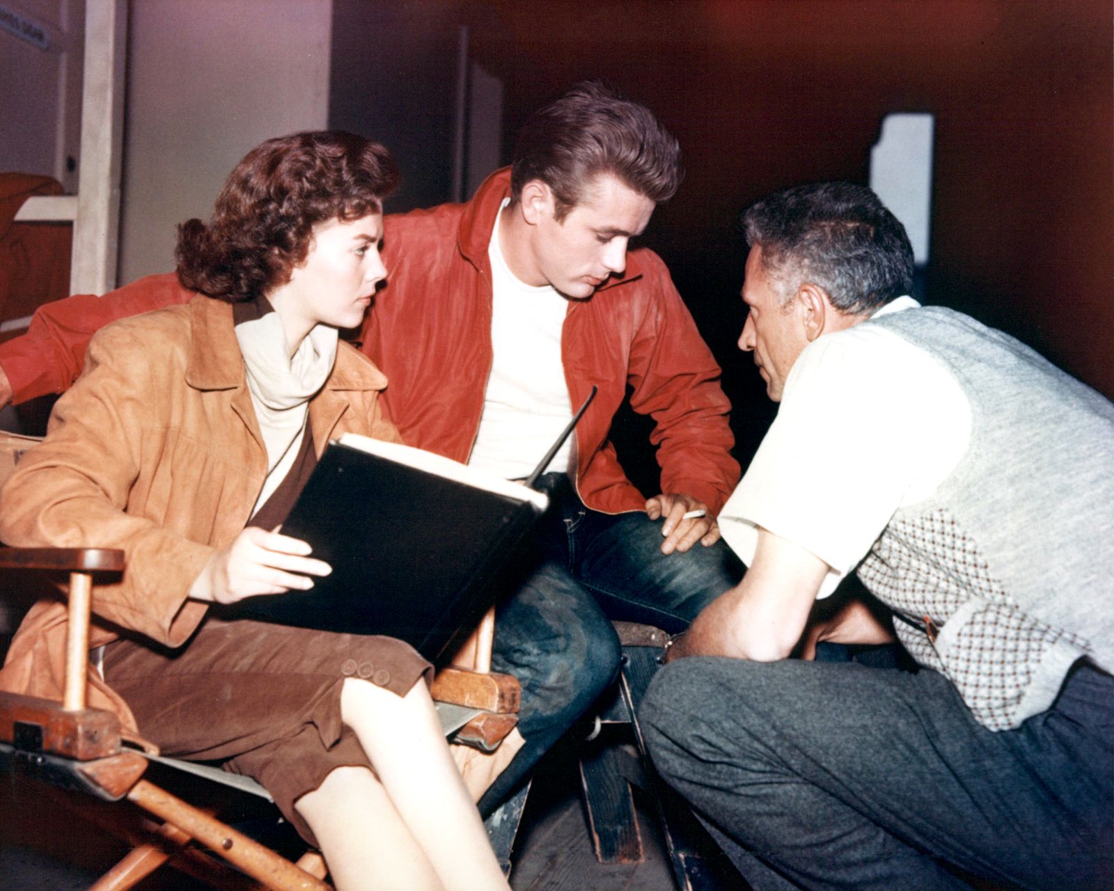 Natalie Wood (1938-1981), US actress, James Dean (1931-1955), US actor, and Nicholas Ray (1911-1979), US film director, on the set of 'Rebel Without a Cause', USA, 1955. The drama, directed by Ray, starred Wood as 'Judy', and Dean as 'Jim Stark'. (Photo by Silver Screen Collection/Getty Images)Silver Screen Collection/Getty Images