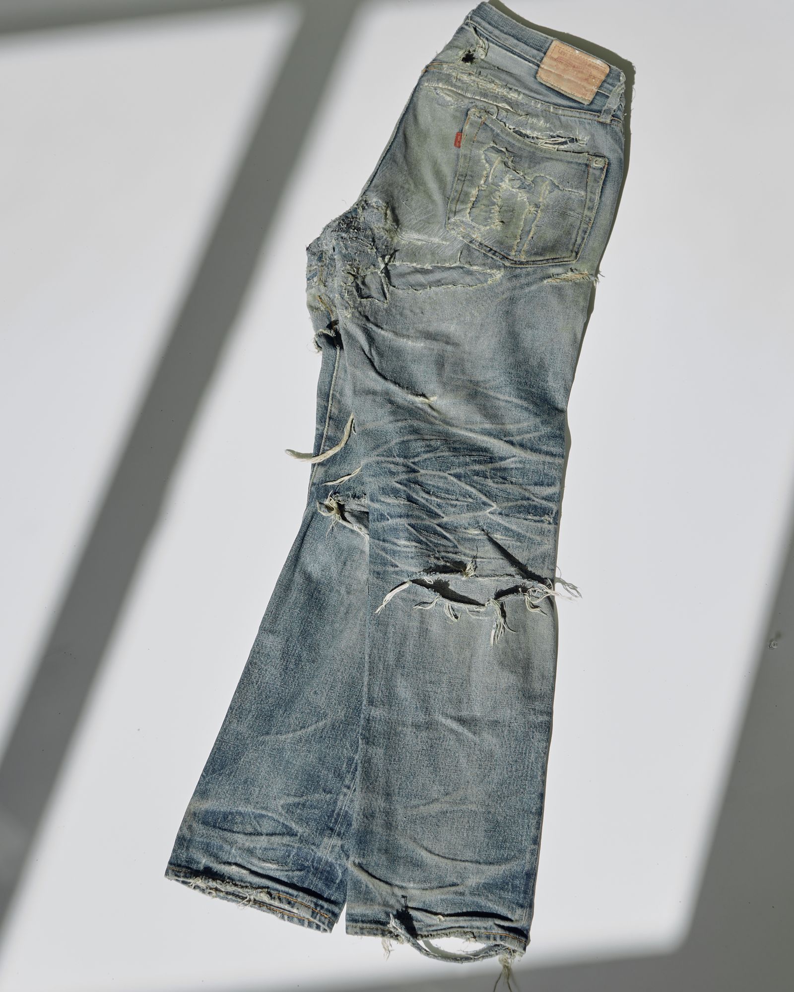 Those jeans have always been a part of the story and the denim. I bought them jeans in 2010 from the Levi’s store on Carnaby Street in London. They’re a Levi’s Vintage Clothing reproduction of the 1954 cut of 501s. I wore those jeans around Europe and the world for I don’t know how many years. They were really ripped and done in by 2015, and there was a night where I was DJing with my crew US Steel, which was me, Benji B, Virgil, and Acyde. And they were basically cracking jokes on me, and someone said something about how my denim was crying. And what made it stick was Virgil started calling me Denim Tears on his blog at the time.