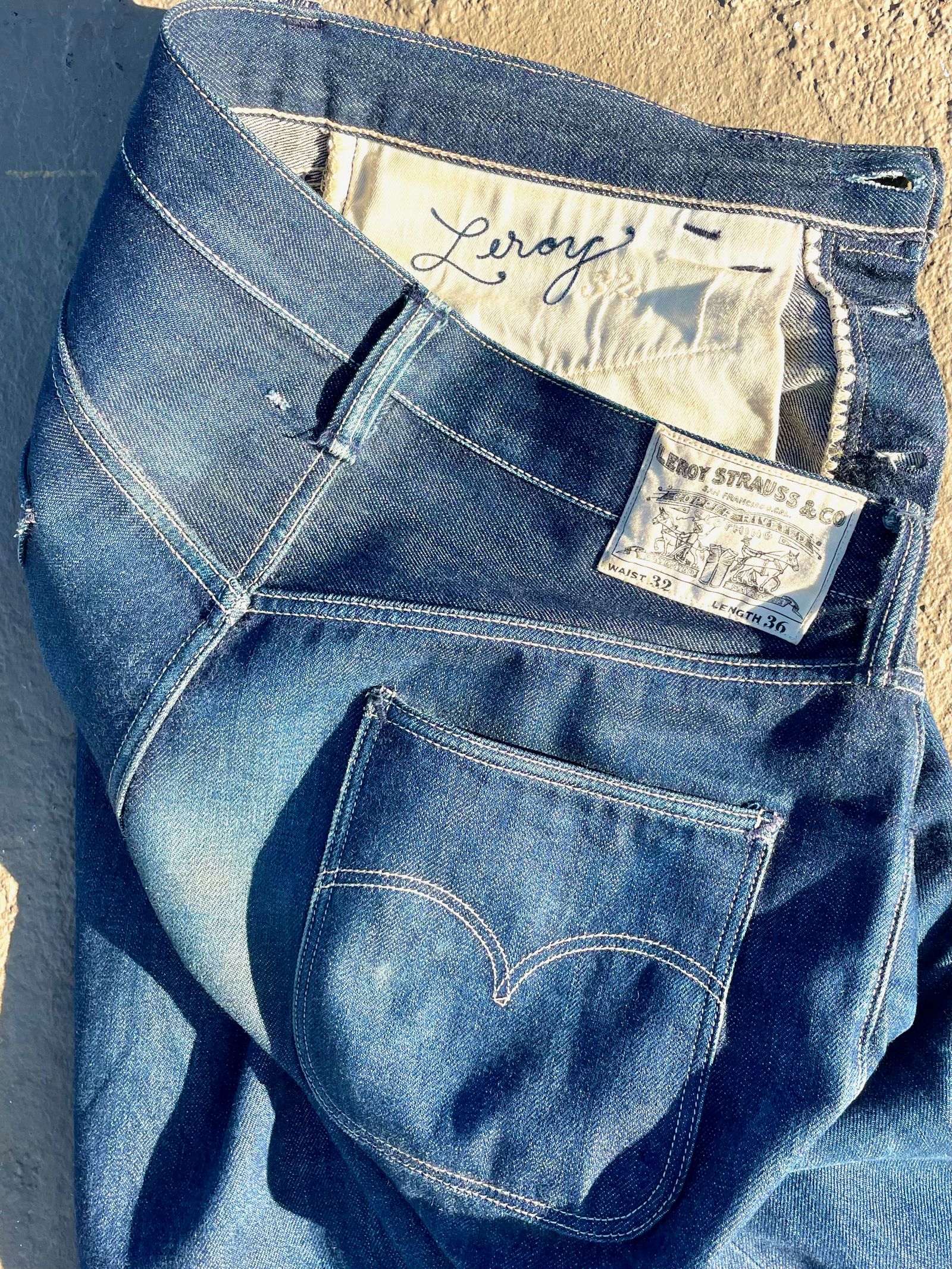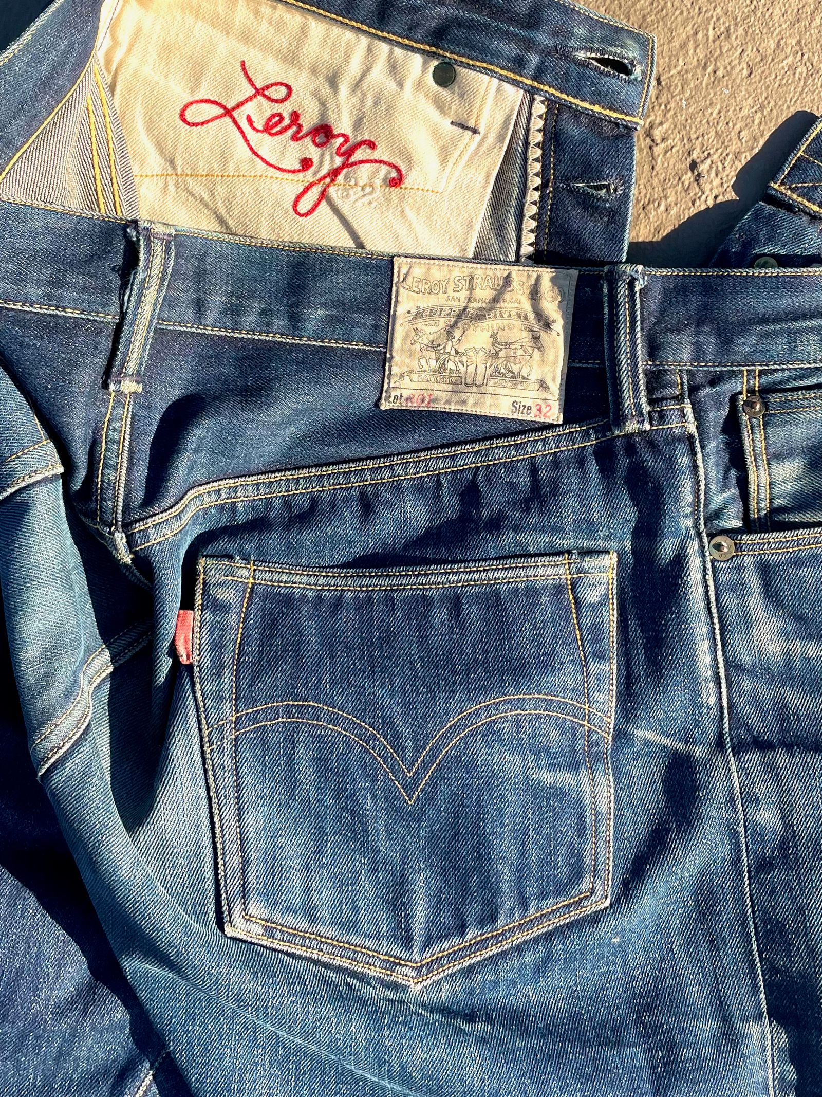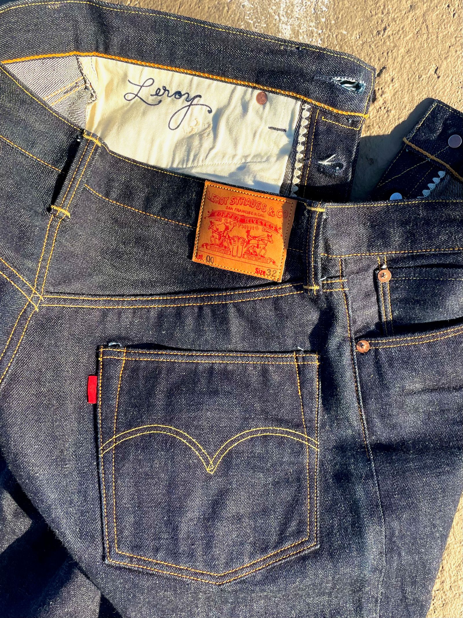 “These are the R01 Leroy from around 2018. The denim is a Cone Mills custom development that had Pima cotton yarns in the weft and pink-line selvedge. It was the second denim that Cone helped me create. The rivets are stamped ‘LSD & CO – SF CA,’ (You know, San Francisco… LSD… I was just trying to be funny.) But I made a rivet stamper and stamped all those rivets myself; it was a whole project. The custom patch art was drawn by the illustrator Florian Bertmer, and the red tab is made from Japanese red chambray. These were sold at Self Edge.”