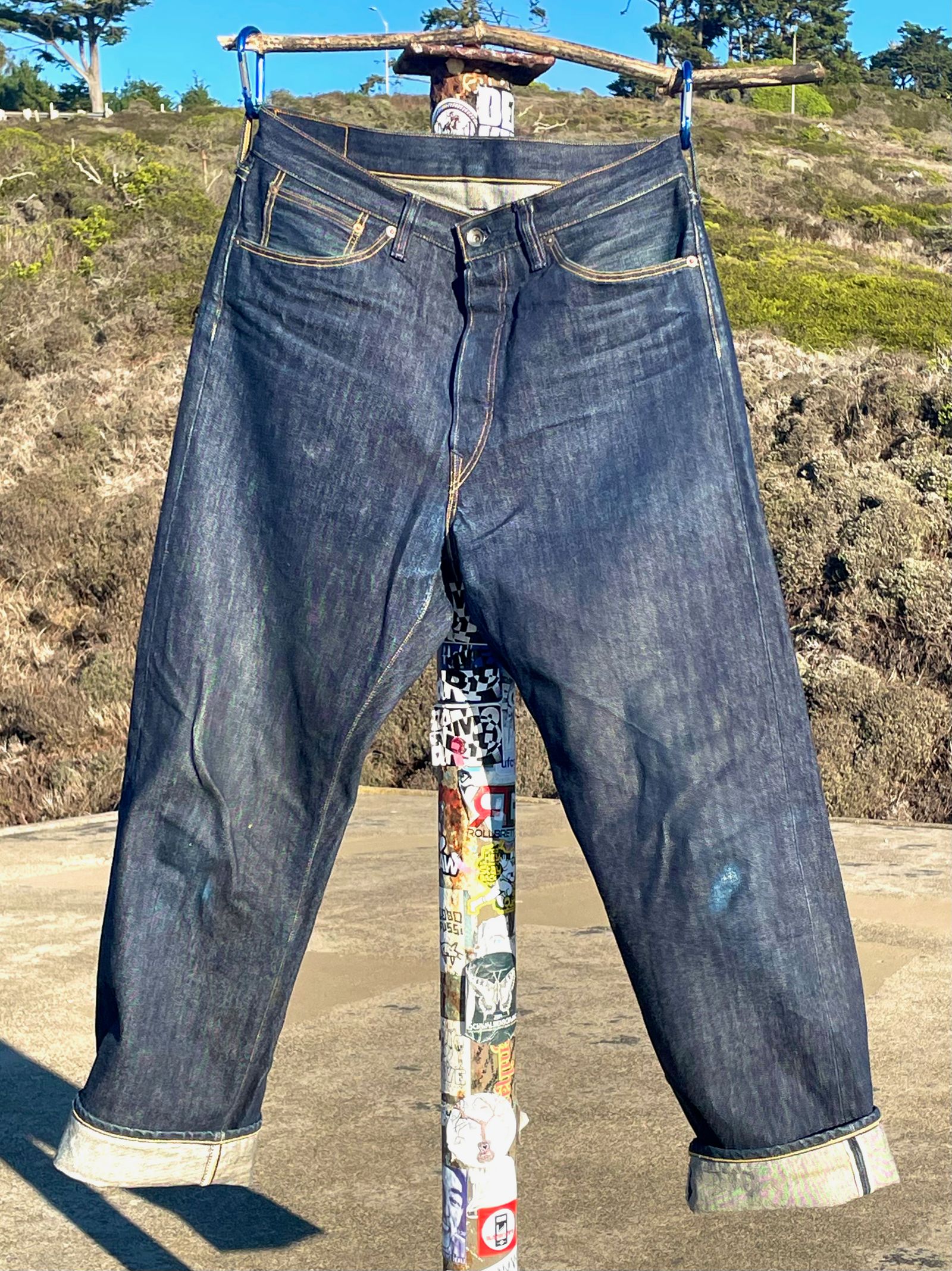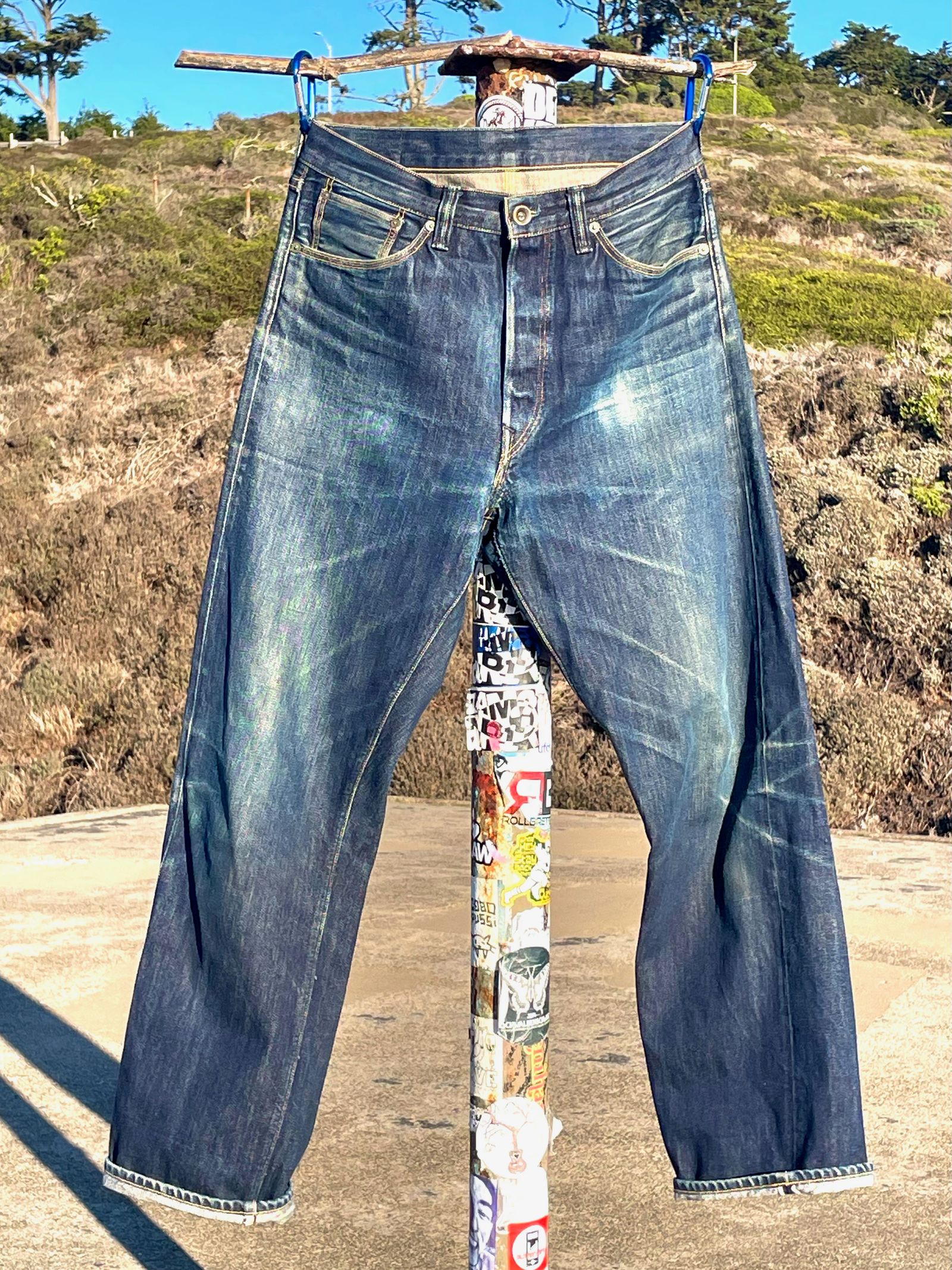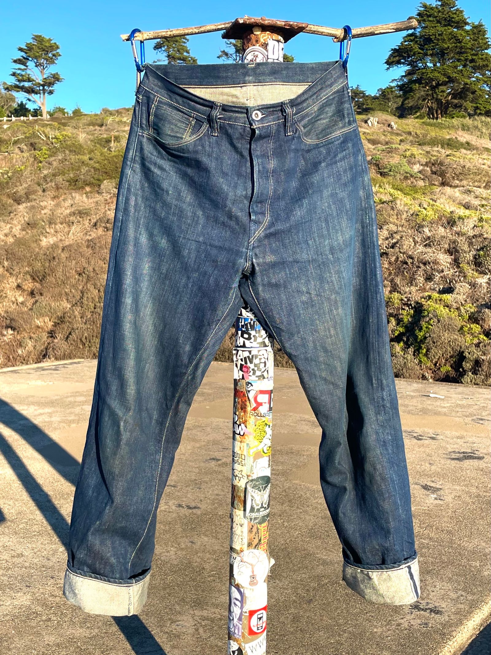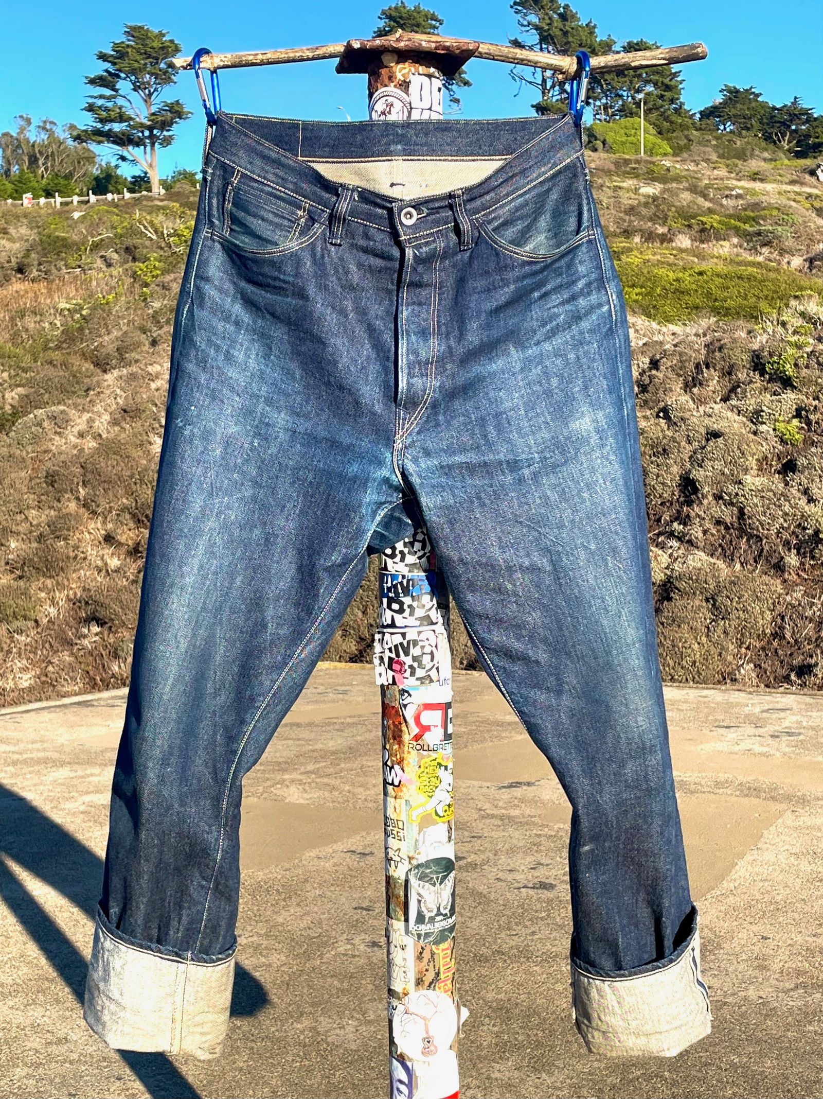 “These are the R01 Leroy from around 2018. The denim is a Cone Mills custom development that had Pima cotton yarns in the weft and pink-line selvedge. It was the second denim that Cone helped me create. The rivets are stamped ‘LSD & CO – SF CA,’ (You know, San Francisco… LSD… I was just trying to be funny.) But I made a rivet stamper and stamped all those rivets myself; it was a whole project. The custom patch art was drawn by the illustrator Florian Bertmer, and the red tab is made from Japanese red chambray. These were sold at Self Edge.”