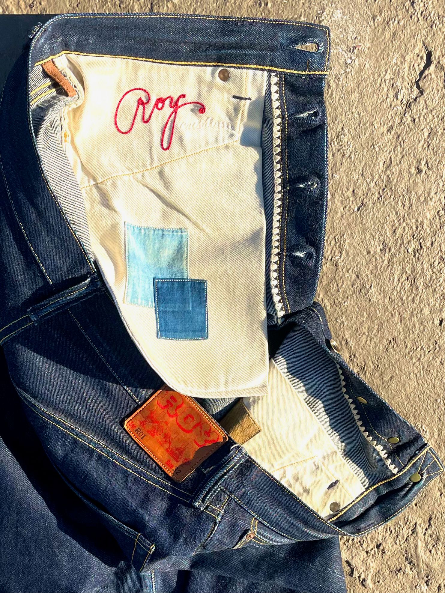 “These are a baggier style of my standard R01 jeans, made from the first loomstate denim that White Oak made for me. It was a heavy denim by Cone standards, about 16 oz. after washing. This pair has all 100% cotton sewing threads and a unique ‘Roy’ chainstitch inside the back pocket lining, which can be seen to be starting a visible fade on the outside of the pocket. There are patches sewn onto the inside pockets from some sentimental artisan-dyed fabrics, and the pockets themselves are made from antique sailcloth salvaged from an old factory in Oakland. It’s difficult to see, but the word ‘custom’ is embroidered in white, next to the ‘Roy’ in red on the pocket inside. This was one of the last pairs I made as I was shutting down… I should have done that little pocket fade thing on some styles before!”