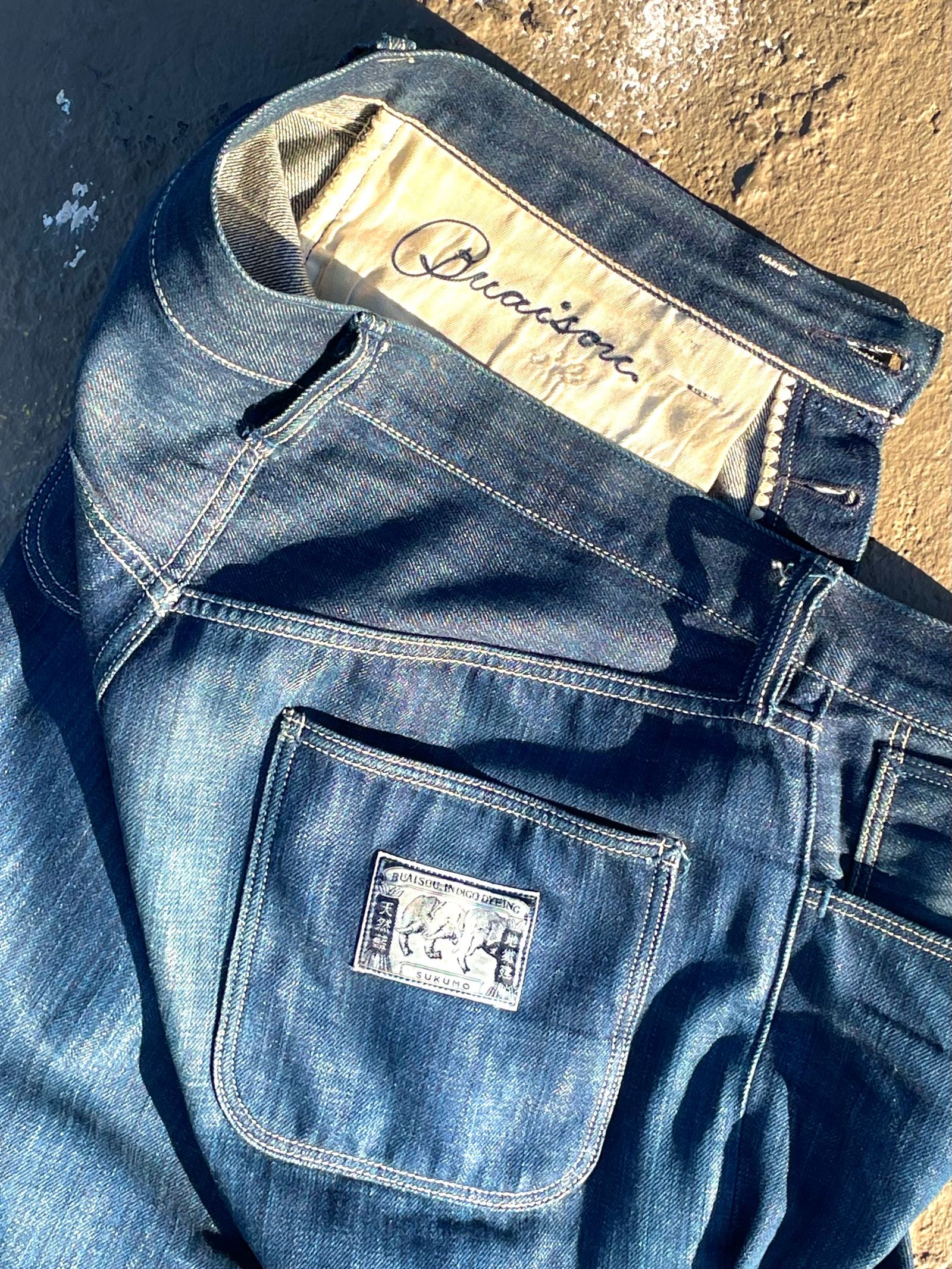 “I made these at the Buaisou Farm, a traditional Japanese dye studio and farm which grows and ferments indigo. It’s in rural Tokushima, in the indigo region next to the Yoshino River. They now have a small jeans factory on site and can pretty much deliver on a farm-to-closet type of clothing, like farm-to-table dining. I was there in 2023 for three months, setting up a sewing studio with all the machines from my old Oakland shop, and I lived in an old house near the farm. Quite an experience. The yarns in this denim were traditionally dyed, which was a two-year project on its own, and woven at a denim mill very close by. The denim is 14.5-oz indigo-dyed, which has an iridescent quality, and the sewing threads are hand dyed with crushed indigo stems, which gives them a tan color. I made about seven or eight pairs of these, one for each member of the farm. We did shirts, too, from another Buaisou 9 oz., so it was like our uniform while I was there.”