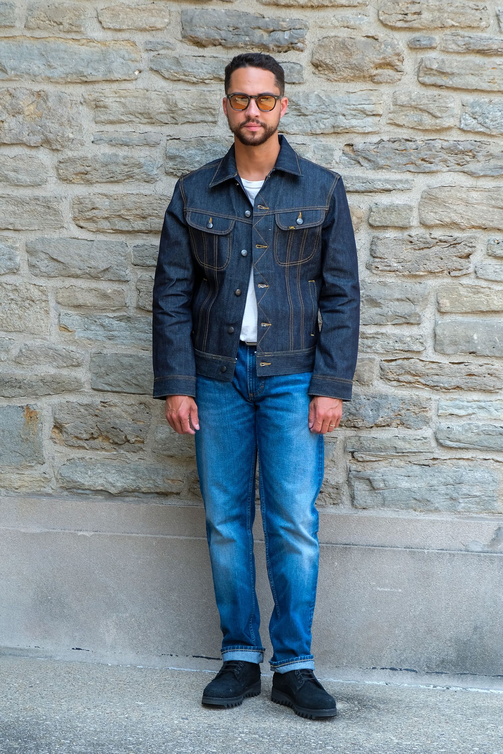 Fast-forward to today, when I’m buttoning up what feels like a piece of denim history with the Lee 101 Rider jacket. Lee 101 is a collection of pieces pulled from the archive, recreated with A-grade denim and an attention to detail. (It’s not the first American denim brand to realize there’s gold in the old catalog; Levi’s has been doing the same for years, with its Vintage Collection 501 jeans in particular.) The Rider makes its presence known the moment I slide my arms into the sleeves.