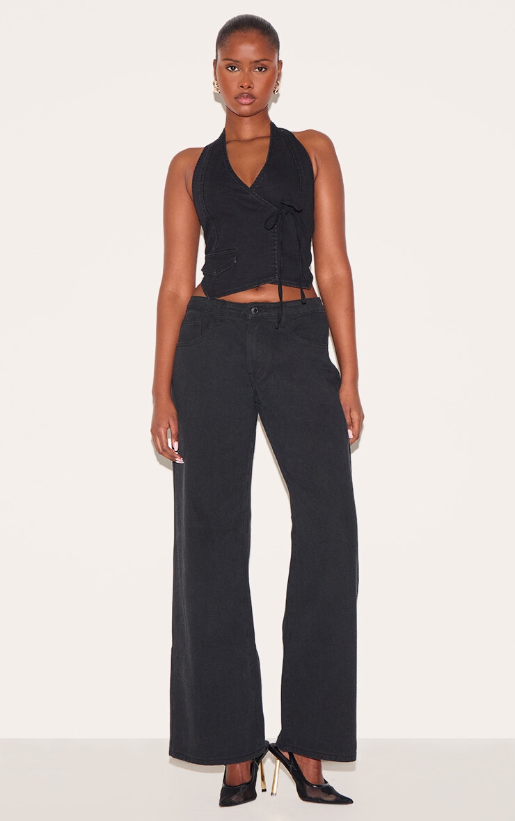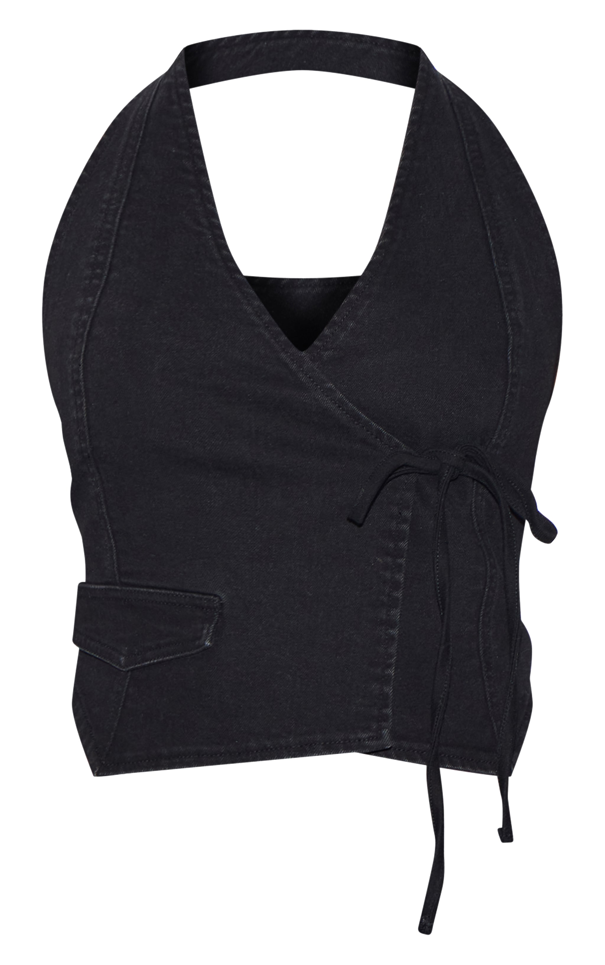 Brought to you in washed black denim with a sleek halter neckline, featuring a faux pocket and wrap front detailing. Team this chic washed black halter neck wrap front denim waistcoat with your favourite pair of tailored trousers, an elegant black heel and gold hoop earrings to elevate your look.