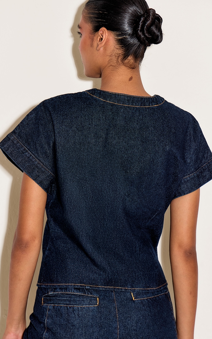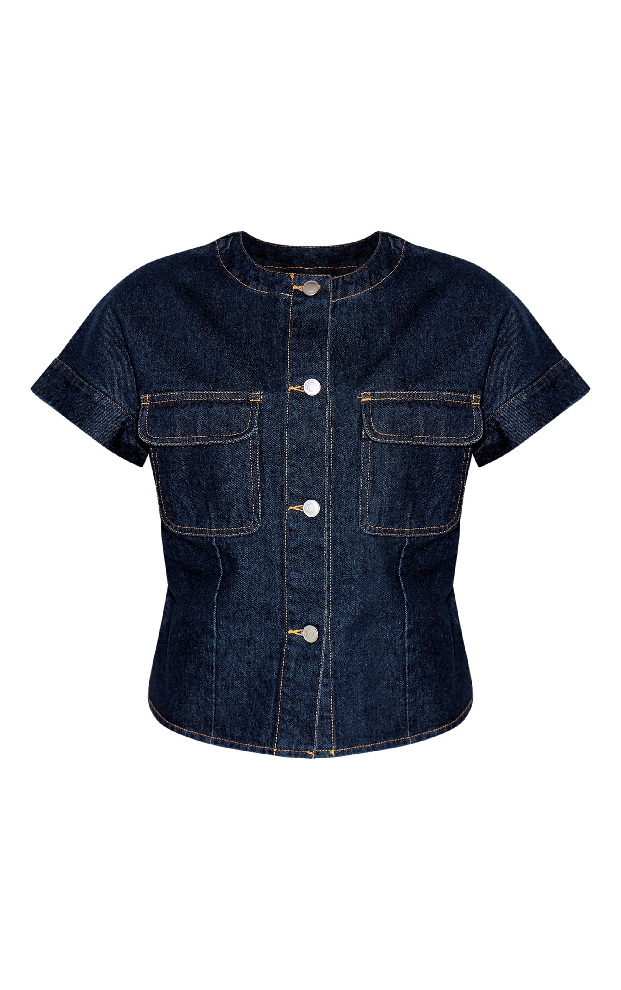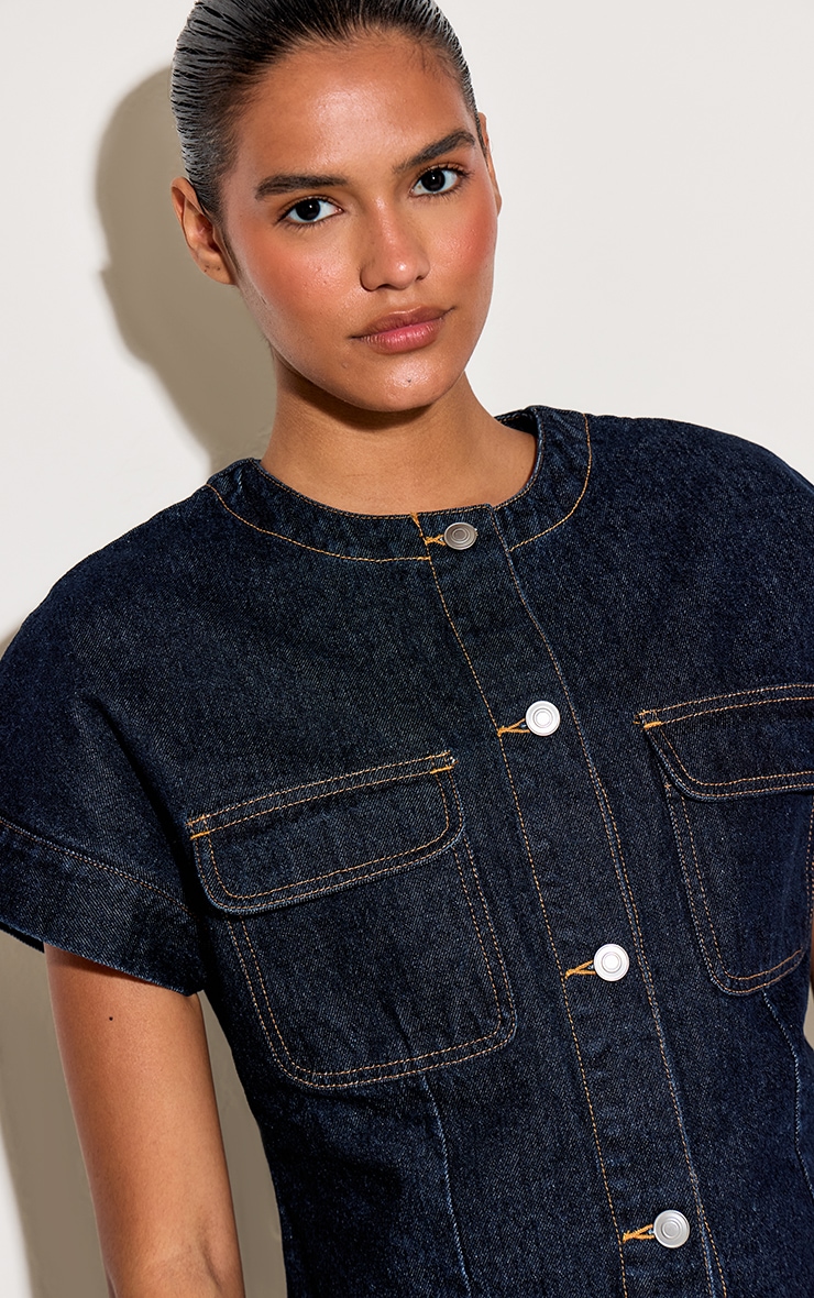 Denim takes a sharp new direction this season. The indigo round neck pocket detail cropped denim shirt reworks a classic with its crisp, contemporary cut, offering a fresh perspective on everyday style. Defined by a clean round neckline, four utilitarian patch pockets, and distinct contrast topstitching, this piece features a full button-down front with sleek silver-toned fastenings. Subtle panel detailing ensures a refined, flattering fit that effortlessly elevates your look. Pair it with the coordinating indigo wide-leg trousers for a powerful denim-on-denim statement that commands attention.