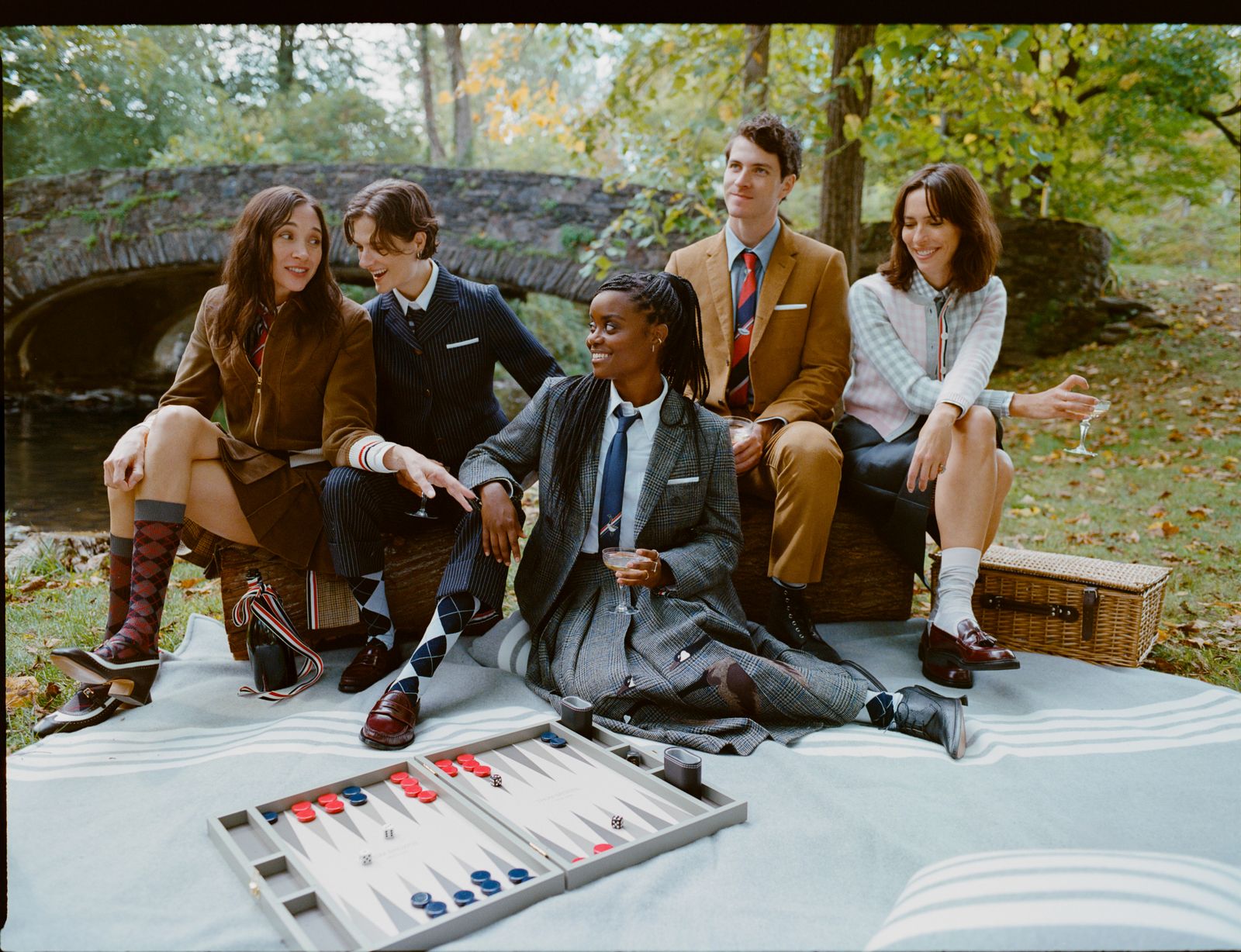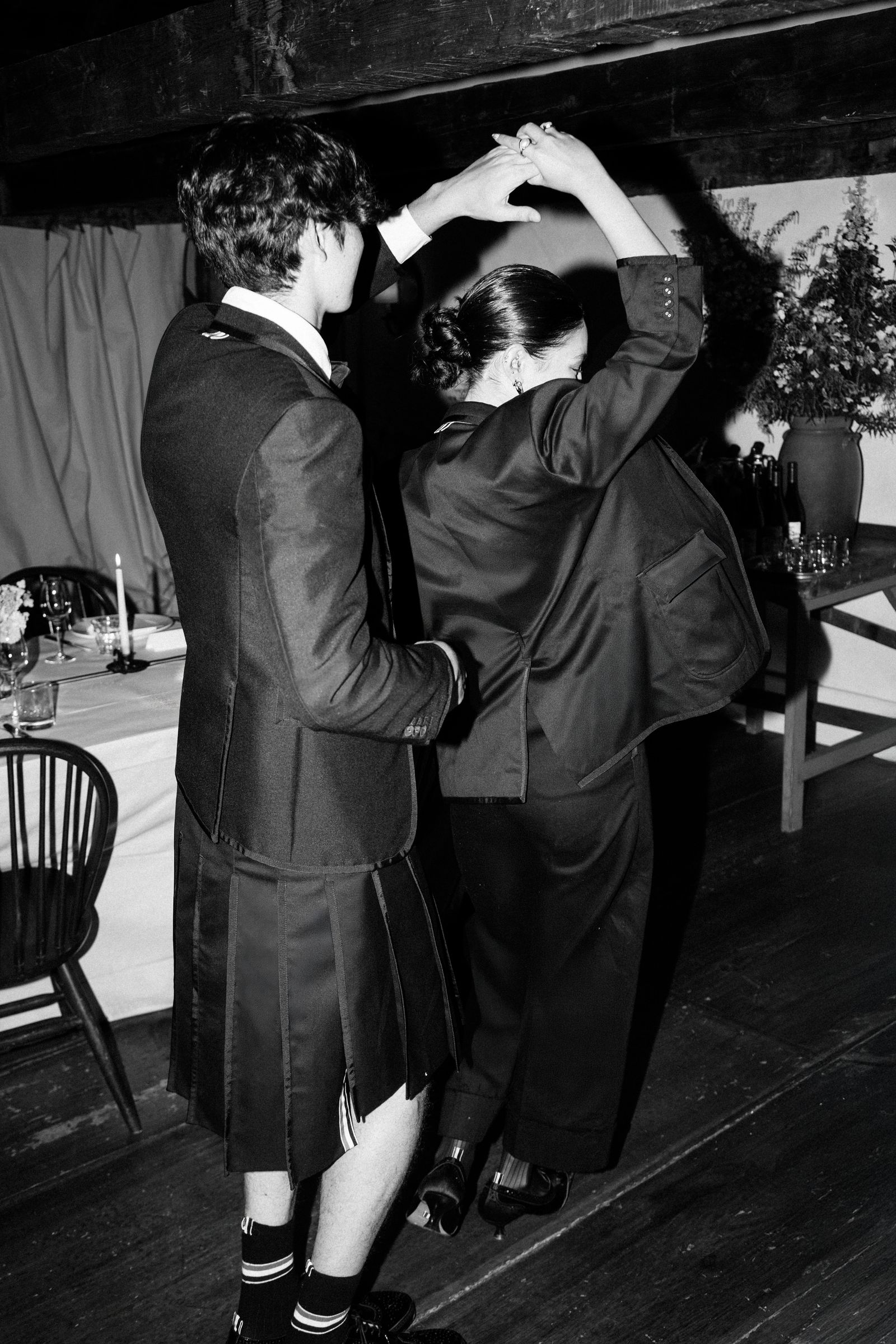Tyler Oyer / Courtesy of Thom BrowneLavish dinners have recently served as a key motif of Browne’s madcap Americana. In early 2020, he published a look book where a group of safari animals show up at a sprawling banquet in Paris and gorge on a gray suit-clad model, who turns out to be made of cake. Last September, Browne took it a step further by skipping a traditional runway show in favor of a raucous feast at Commerce Inn, where a tableful of celebrity guests sported his new collection. This occasion was technically a campaign shoot for a winter 2025 black tie collection, but it felt more like an excuse for Browne to get some of his favorite actors together over oysters and fish pies.