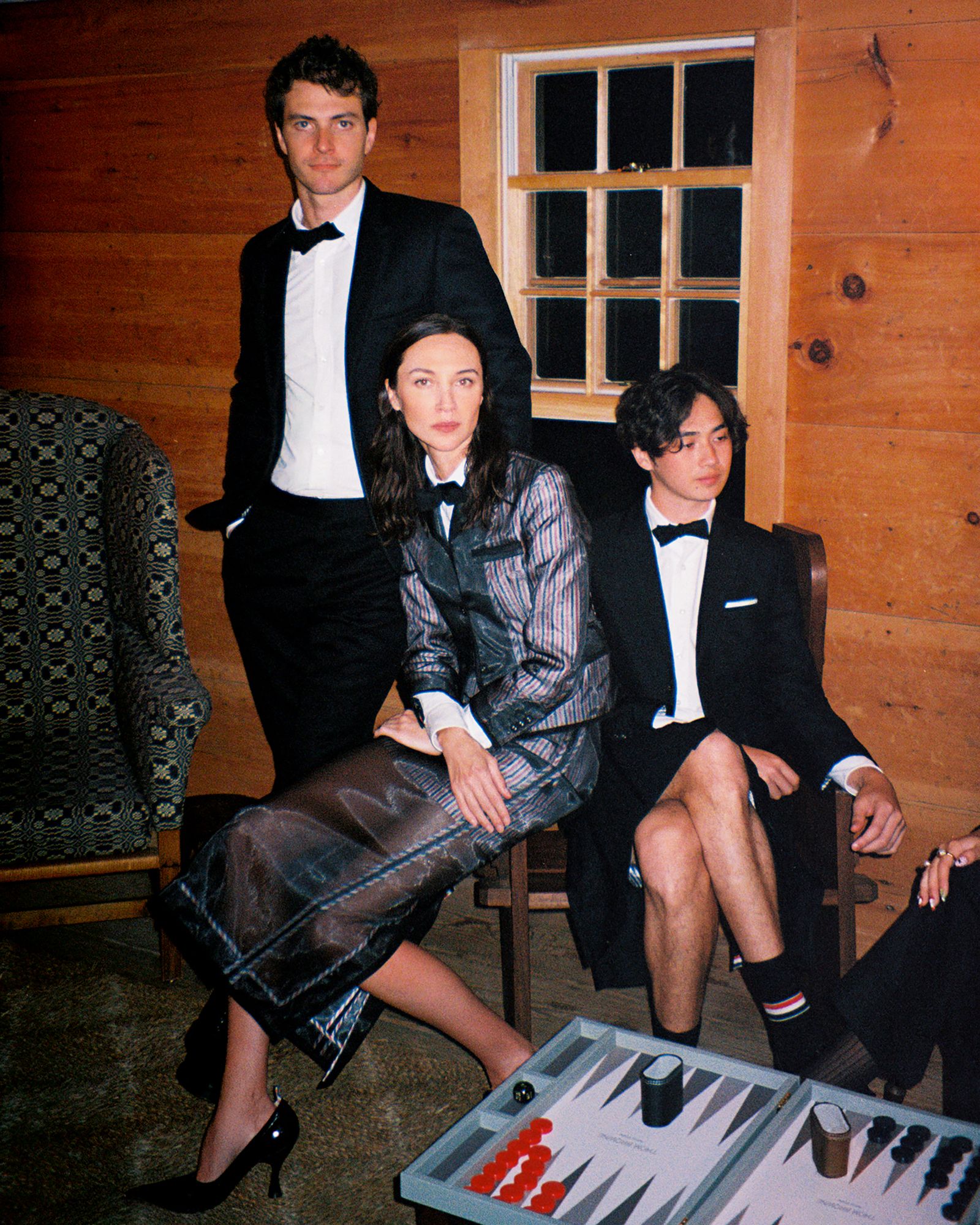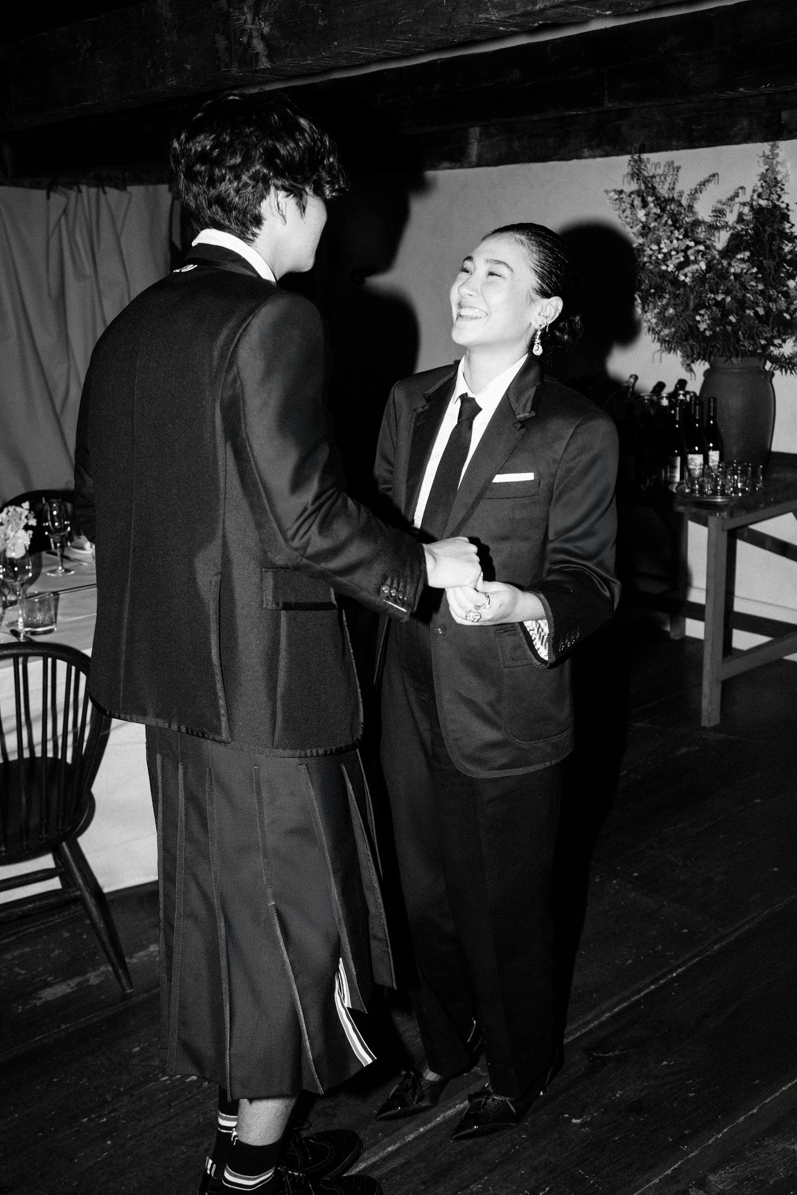 From there, Browne isn’t so uptight. “In the shape and the proportion, I stick to classic Thom Browne, but the fabric can be anything,” he added. “It can be black denim, it can be black cotton canvas, it can be mohair, wool, or cashmere.” Case in point, Sydney Lemmon’s tuxedo dress was tailored inside-out, lining exposed; my own tux that evening was made out of sturdy workwear canvas, like the world’s most elevated Carhartt set.