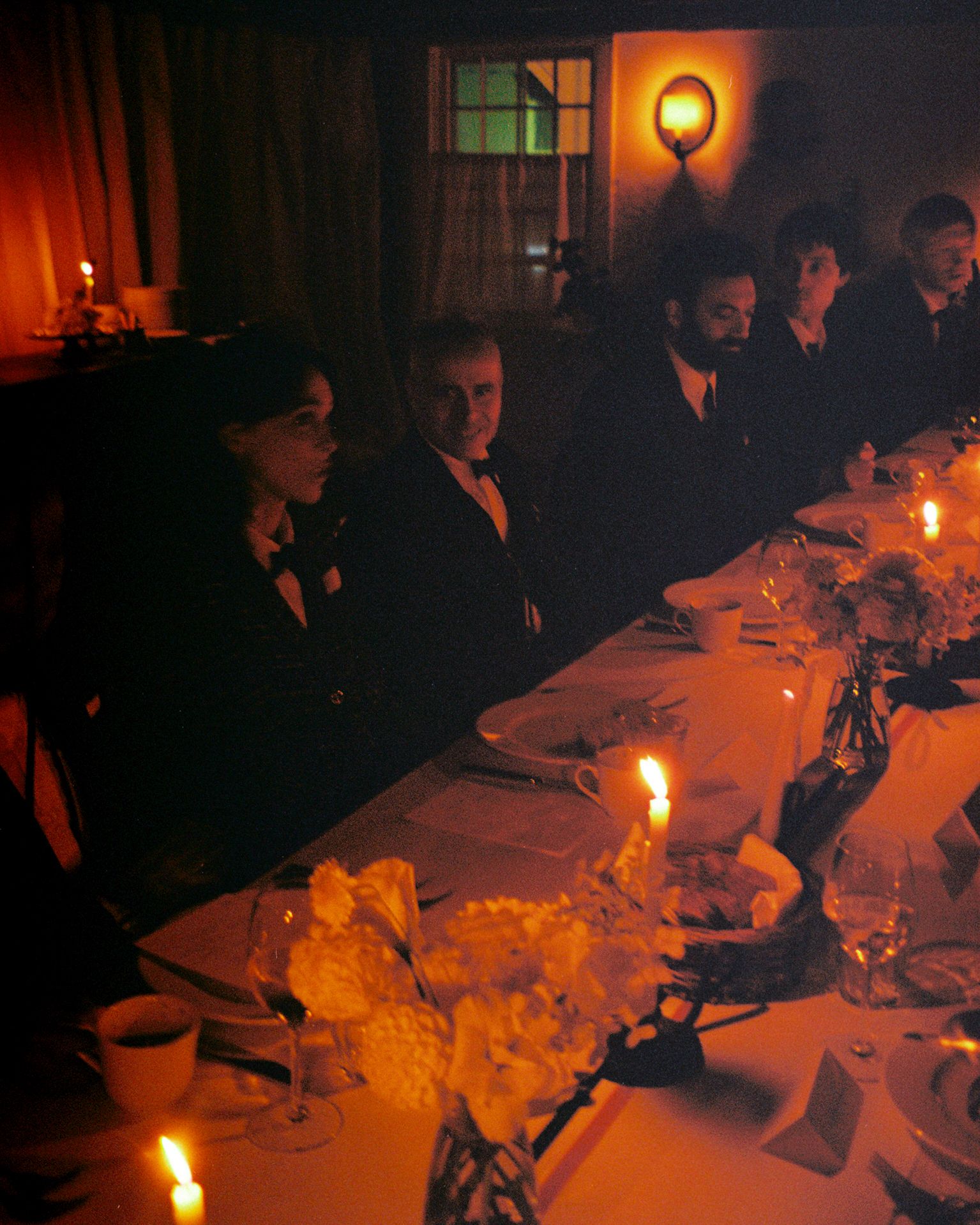 On a recent autumnal Sunday, Browne met a group of actors for dinner at Stissing House, a colonial-era tavern a short drive away. A long dining table was set with white linens and flickering candles, and everyone was wearing a different Thom Browne tuxedo. “It’s very Dracula pastoral,” quipped Rebecca Hall, as she walked in alongside her husband, Morgan Spector, followed by his The Gilded Age castmates Louisa Jacobson and Denée Benton. With a fire in the hearth, The Summer I Turned Pretty alums Sean Kaufman and Minnie Mills got cozy, draped in his-and-hers black tie.