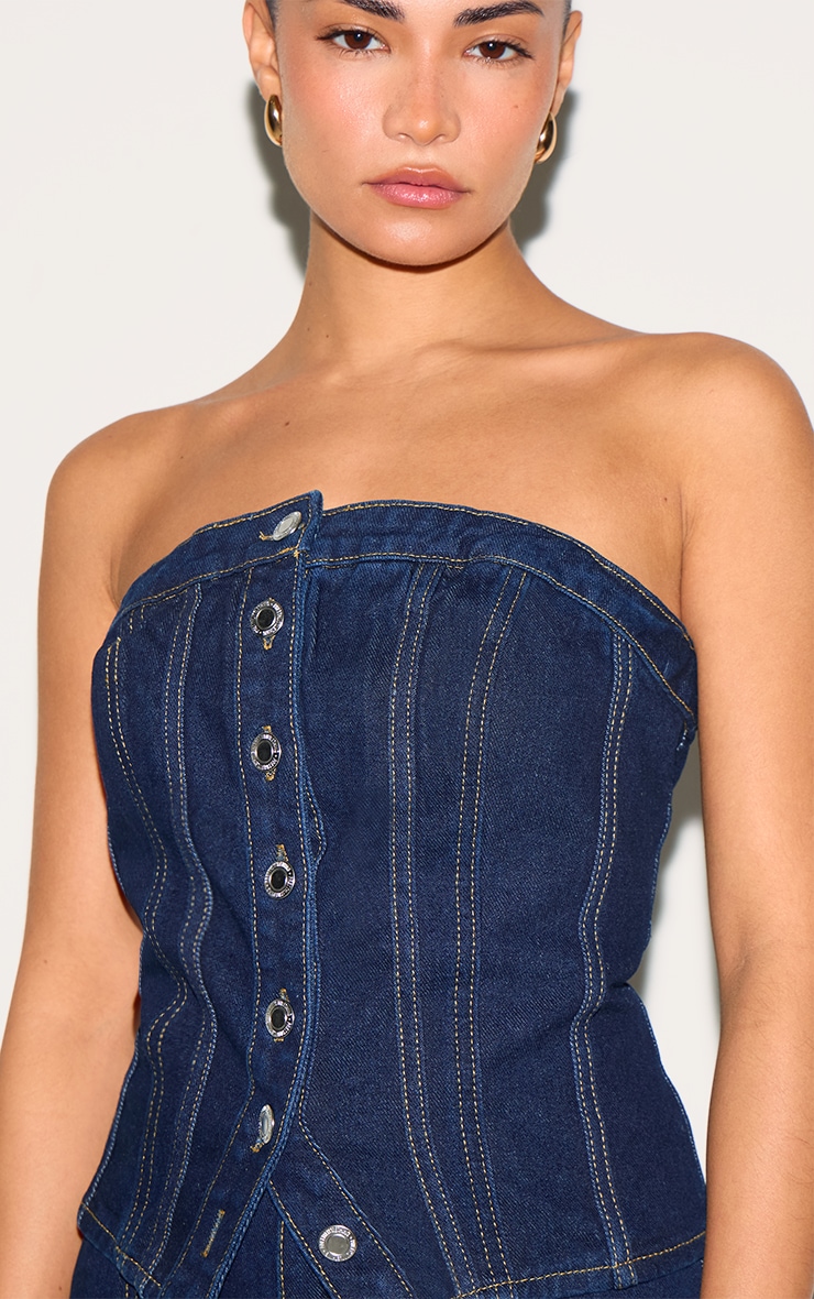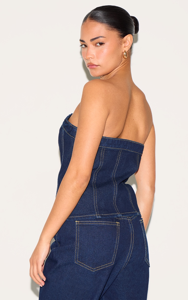 Woven with treatment, this bandeau bodice is made from dark indigo jeans with bodice design sewing and switch attachments. Look remarkable when you design this tiny dark indigo comparison joint bandeau bodice with the matching flared denims, underrated gold stud jewelry and a trendy set of neutral sharp toe heels.