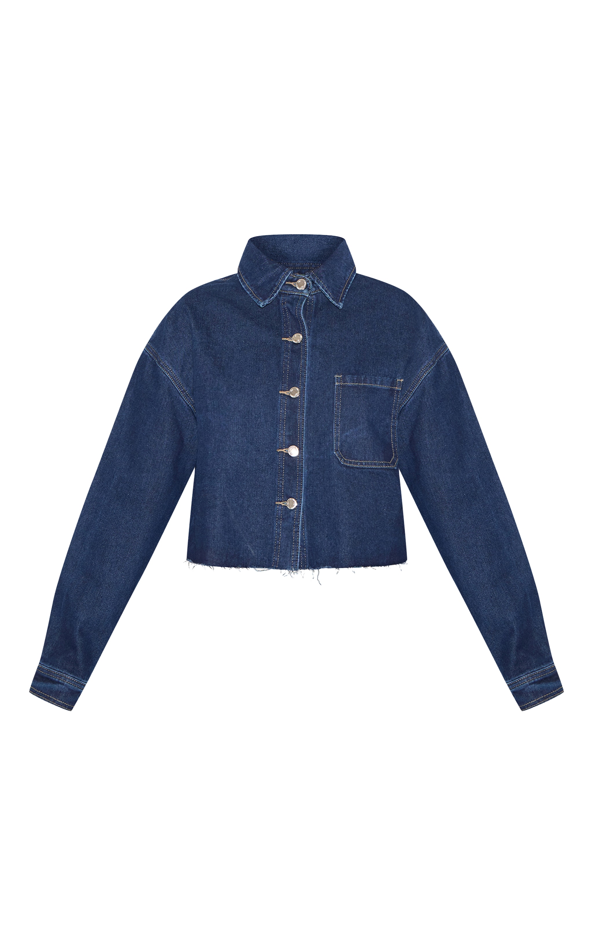 Made from an indigo jeans product with a raw hem layout and a lovely chopped size. Group this indigo raw hem chopped jeans t-shirt with a set of broad leg pants and your best gold jewelry for an edgy surface.